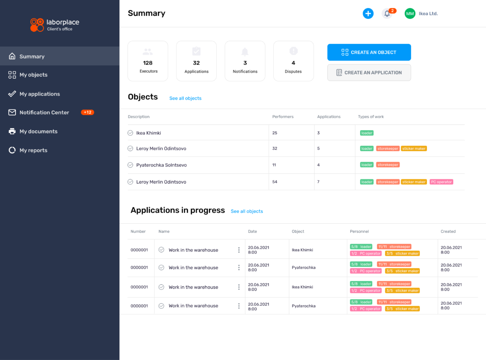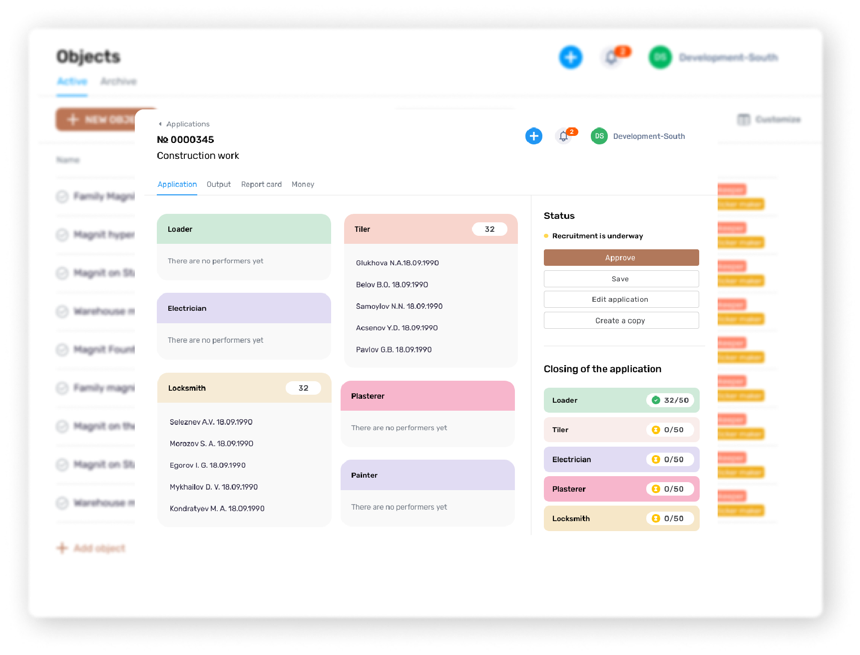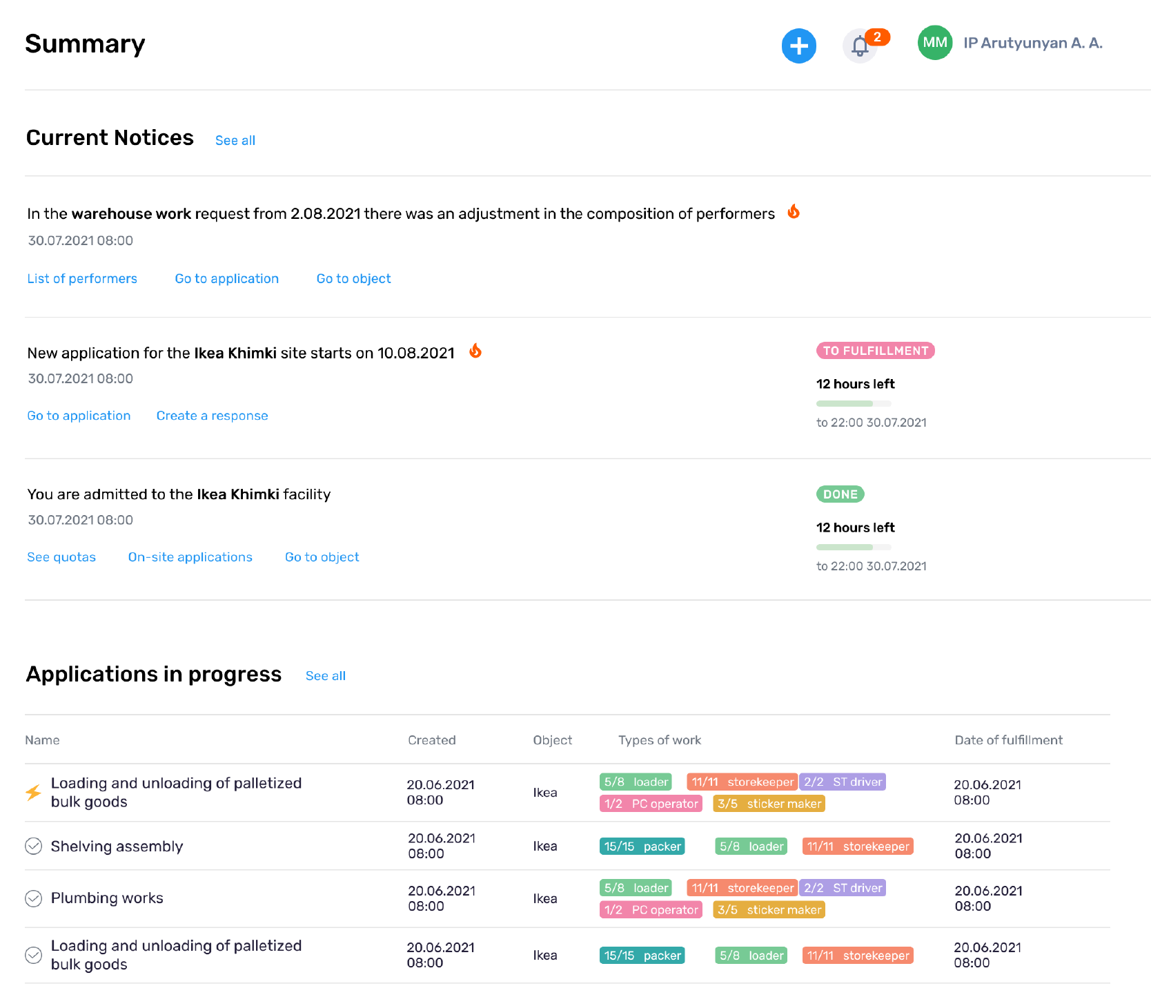If the object is a permanent job, then requests are daily tasks. Applications can be viewed in the corresponding section of the account in the form of a list or by object. On the application page you can monitor recruitment and keep a report.