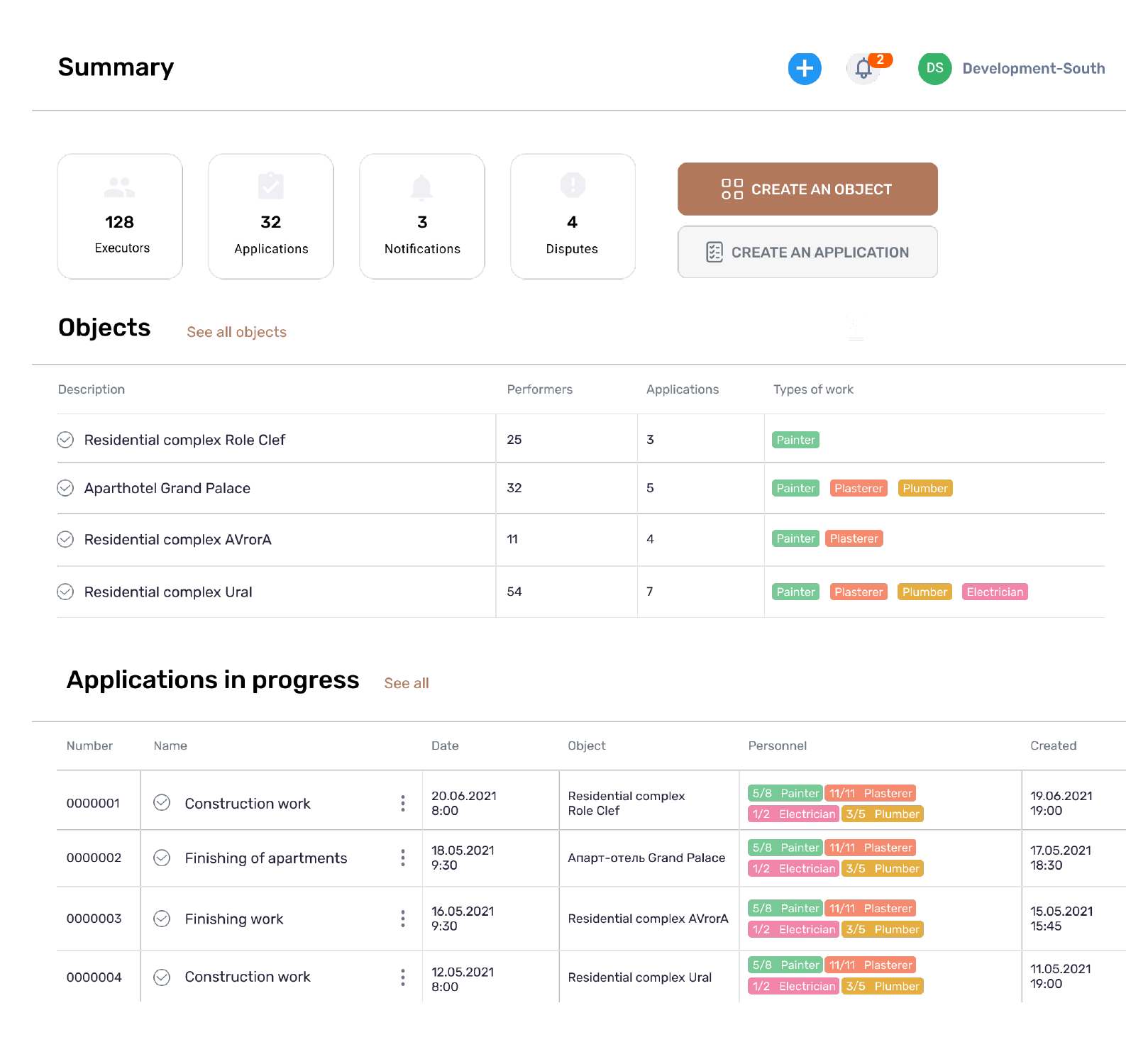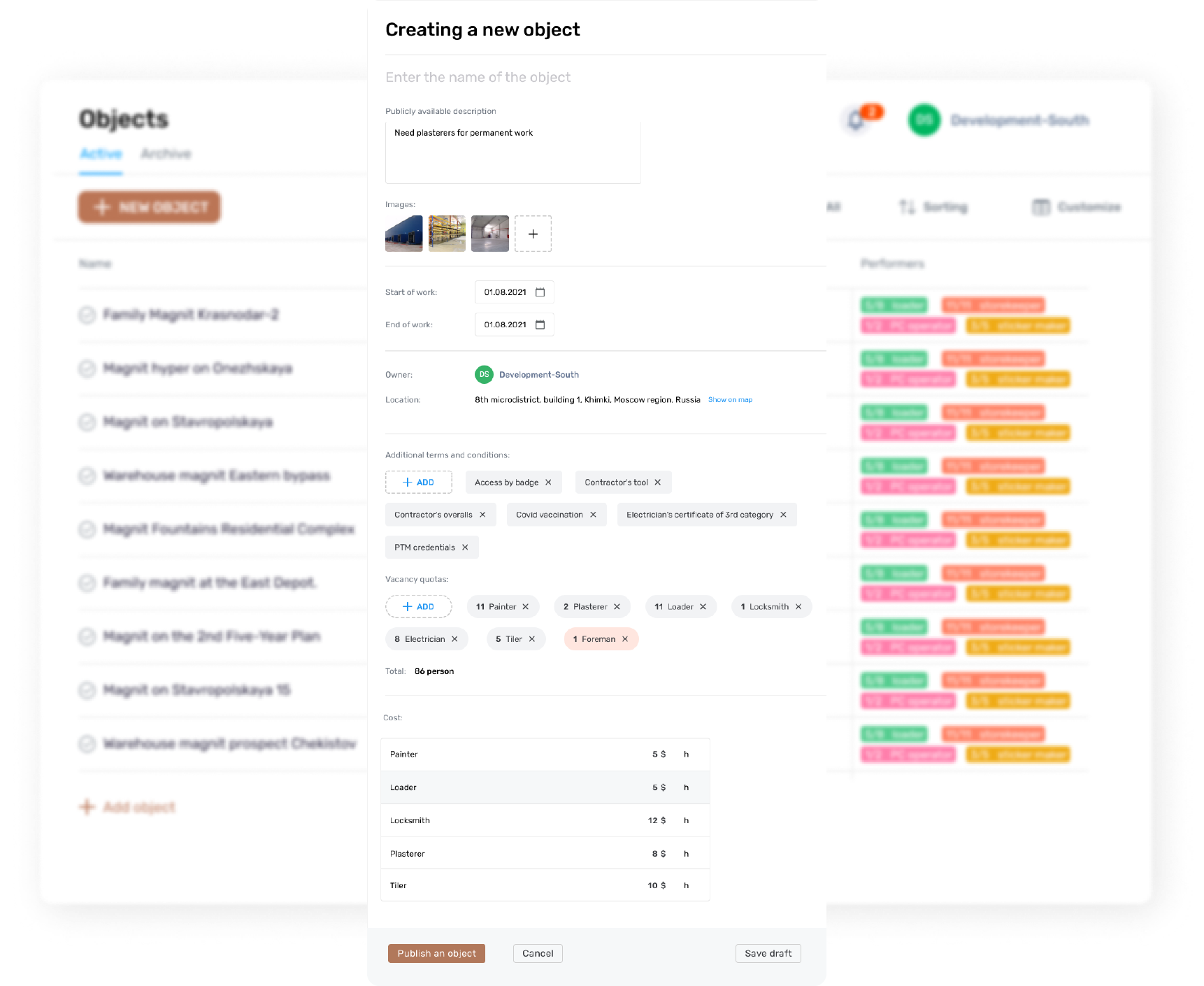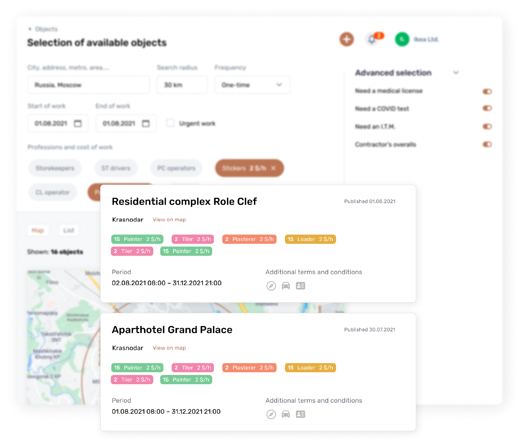 The contractor searches for new objects using filters by location, date, profession and cost of work. Suitable objects can be viewed on a map or in a list. Next, you can go to the object’s page and submit an application for admission.