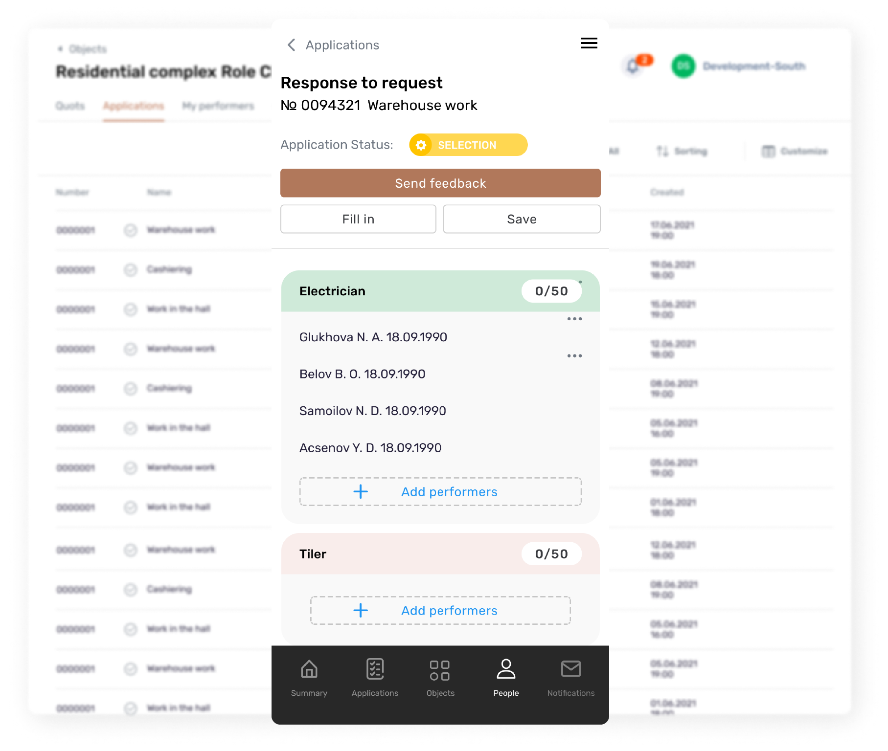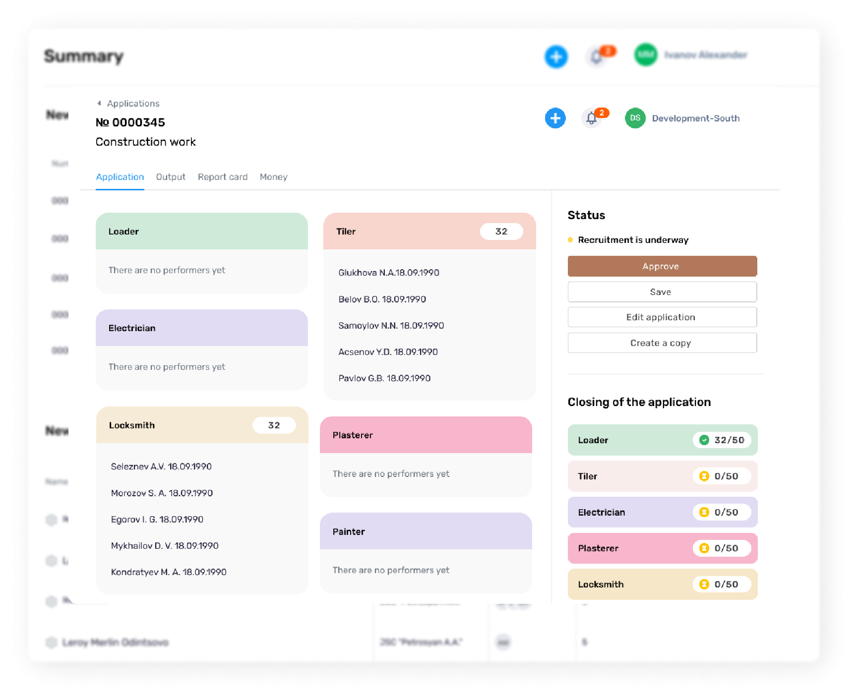 Once the contractor receives clearance, the site’s applications are opened to him. We need to create a response to applications, where we select people from our list of performers. After submitting your application, you can monitor its status in the section of the same name.