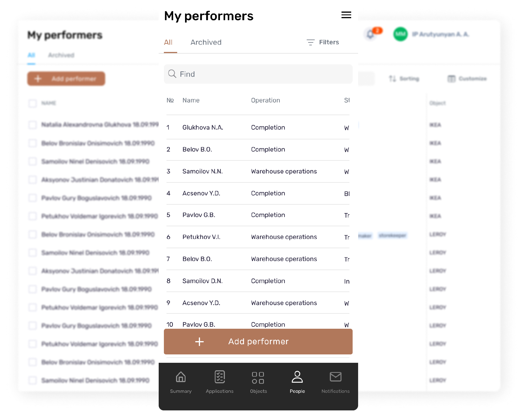 Through his personal account, the contractor can add new performers. All performers can be viewed in the corresponding section. Each performer has his own page with personal data and activity history.