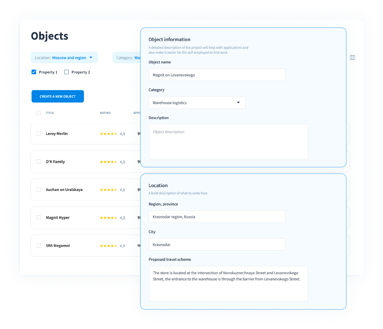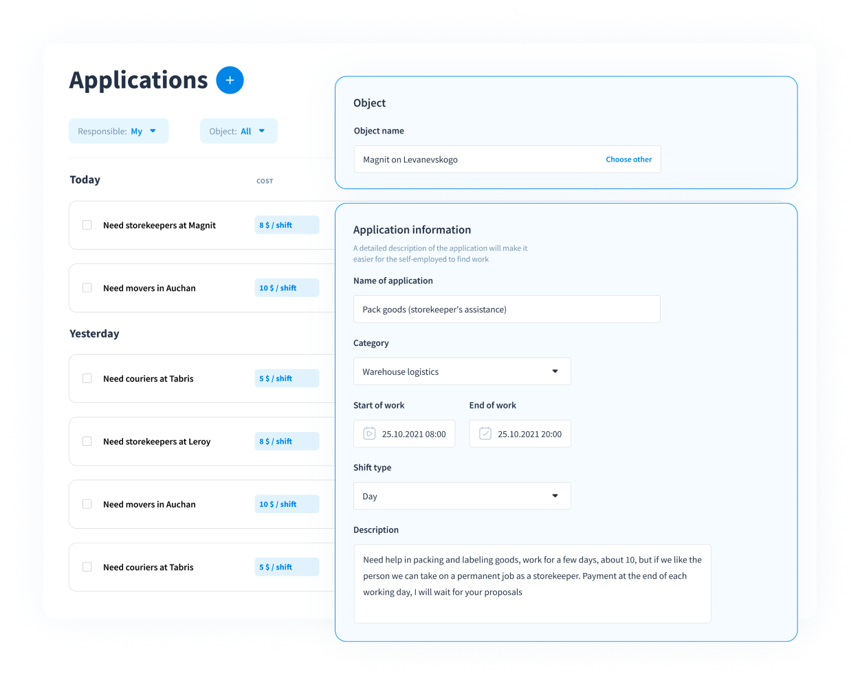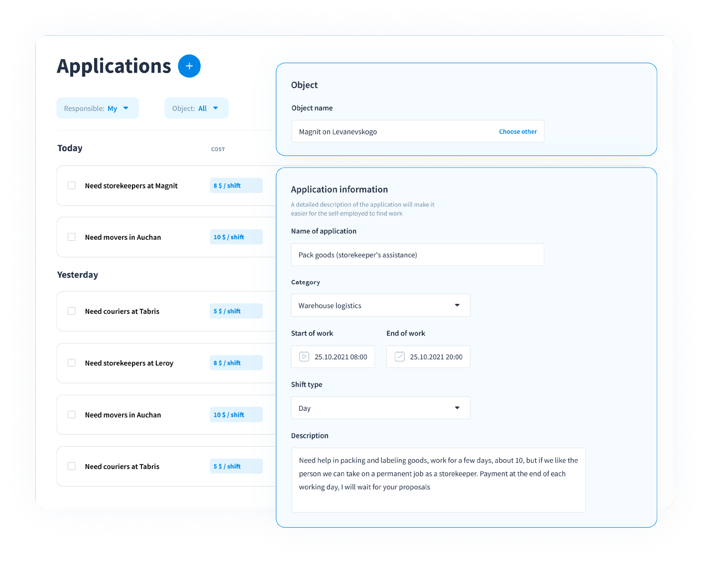 To start hiring people, the client needs to create an object. An object is a place of work, for example, an enterprise, a store or a warehouse.